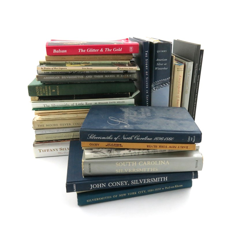 including: Silver in Maryland, Silver in the Golden State, Early American Silver, Myer Myers, Massachusetts Silver in the Harrington Collection, Tiffany Silver Flatware, Jacob Hurd and his Sons, American Silver at Winterthur, Silversmiths of North Carolina, South Carolina Silversmiths and other volumes. (qty) (two boxes).