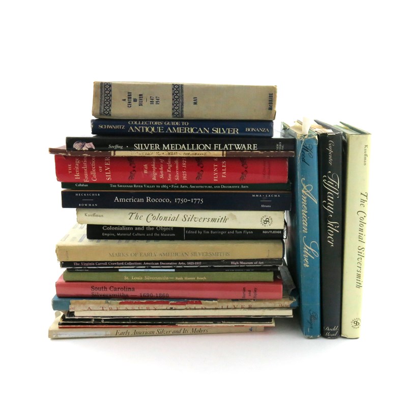 including: Marks of Early American Silversmiths, American Silversmiths in British North America 1776-1800, New Hampshire Silver, Spratling Silver, Tiffany Silver, South Carolina Silversmiths, St. Louis Silversmiths, American spoons, and other volumes. (qty) (two boxes)