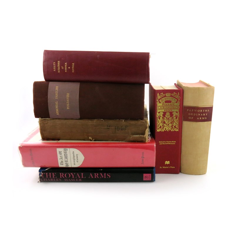 Papworths Ordinary of Arms, reproduction of the original edition of 1874, Tabard Publications Limited, 1961, Debretts Peerage and Baronetage, 1995, armorial Families, Fox Davies A,. Fifth edition, 1905, The Art of Heraldry, Kelly's Directory of Norfolk and Suffolk, The Royal Arms, and one volume of Fairbairns, (a.f). (7)