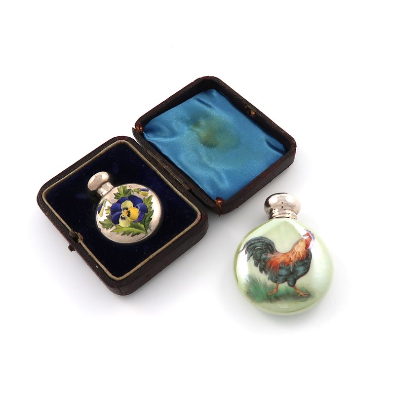 circular form, the front enamelled with a purple and yellow pansy, screw-off cover, in a fitted case, length 3.8cm, plus a silver-mounted ceramic scent bottle, decorated with a cockerel. (2)