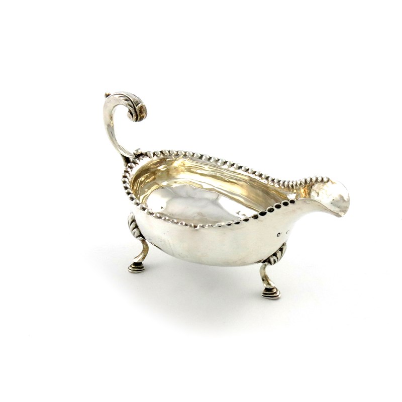 oval form, leaf capped scroll handle, punch bead border, on three shell capped hoof feet, length 18cm, approx. weight 4.9oz.