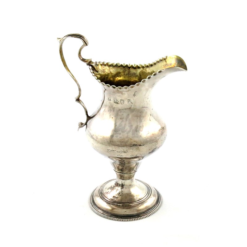baluster form, leaf capped scroll handle, punch-bead border, on a raised circular foot with a rope-work border, height 12.8cm, approx. weight 2.3oz.