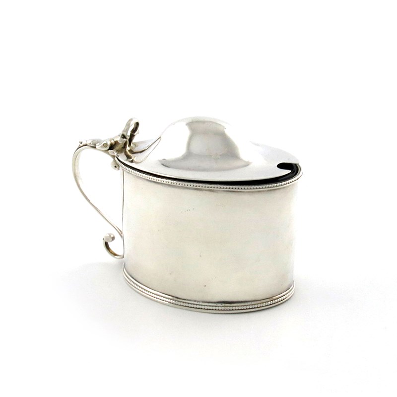oval form, scroll handle, domed hinged cover, with a pierced thumb-piece, beaded borders, engraved with a crest, with a blue glass liner, length 10.3cm, approx. weight 3.3oz.