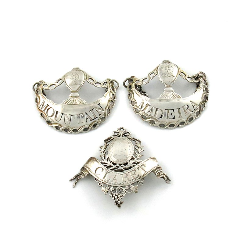 crescent and urn form, with pierced garlands and reeded borders, incised 'MADEIRA' and 'MOUNTAIN', crested, length 4.8cm, plus a single George III silver wine label, by Hester Bateman, London circa 1780, banner form, with a pierced ribbon tied oval cartouche, incised 'CLARET', approx. total weight 1.1oz. (3)