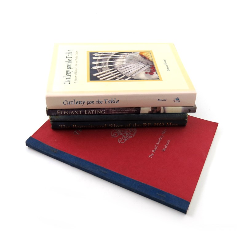 Lambert, J.M. The Portraits and Silver of the RE Headquarter Mess Chatham, Institution of Royal Engineers, 1963, plus a similar 1909 copy, plus The Silver Room, The Royal Artillery Mess, Woolwich, and Elegant Eating and Cutlery for the table. (5)