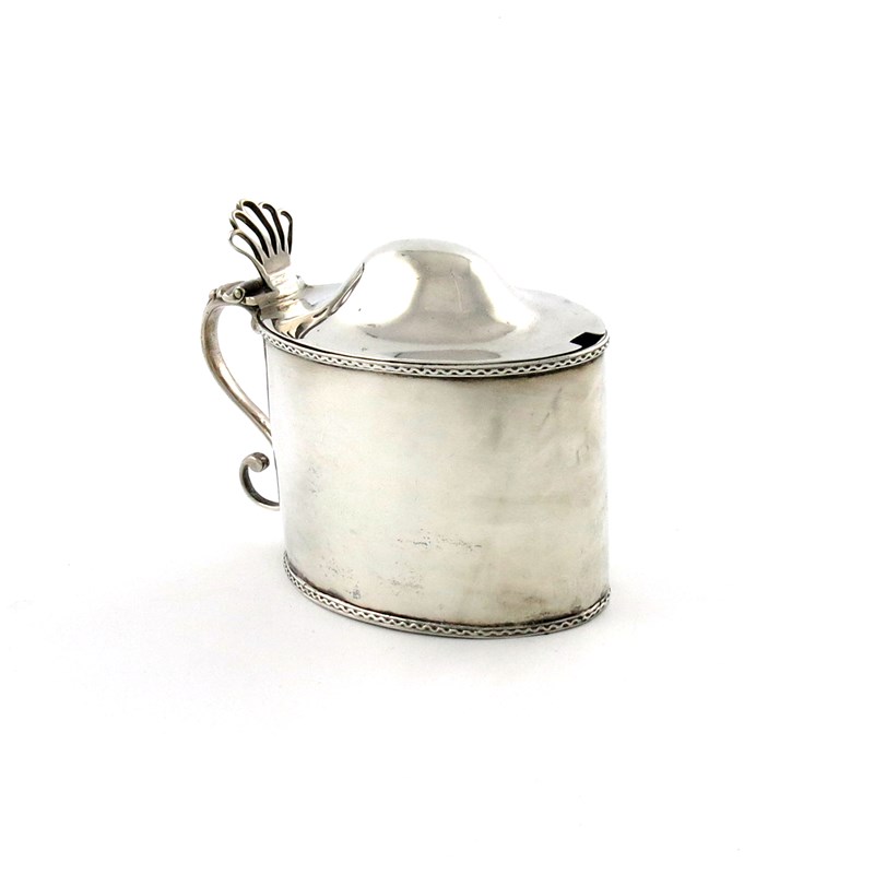 oval form, scroll handle, domed hinged cover, with a pierced thumb-piece, bright-cut borders, with a clear glass liner, length 10.5cm, approx. weight 3.8oz.