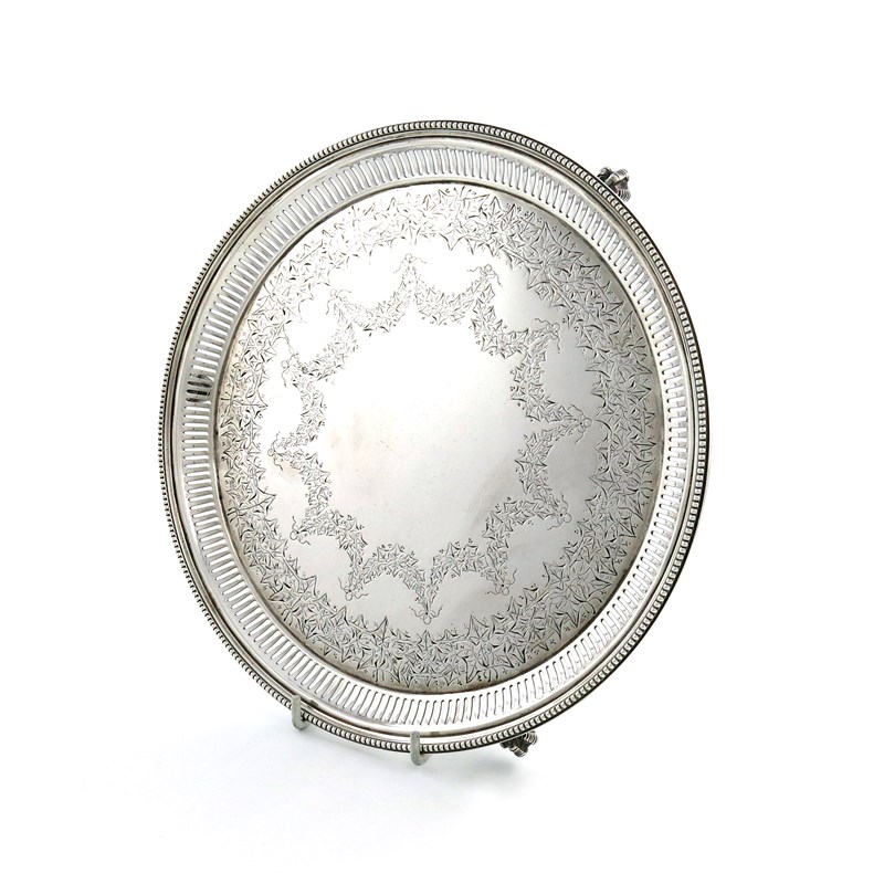 circular form, pierced with slats and with a beaded border, the centre with engraved foliate decoration, on three claw and ball feet, diameter 24.5cm, approx. weight 15.5oz.