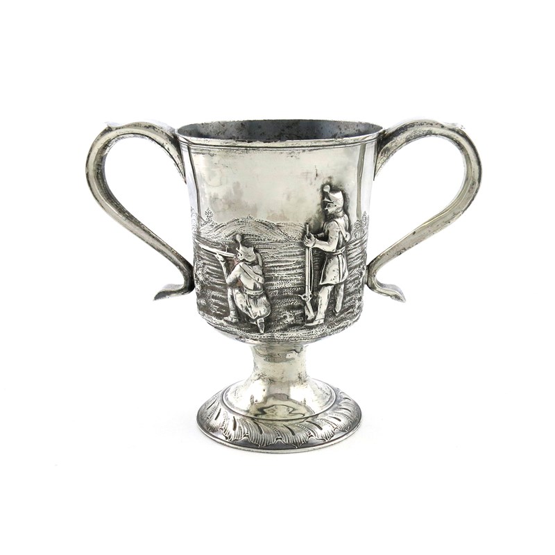 circular form, scroll handles, later embossed with riflemen in a landscape setting, the other side with a vacant cartouche with tree surrounds, on a raised circular foot, height 18.5cm, approx. weight 16.5oz.