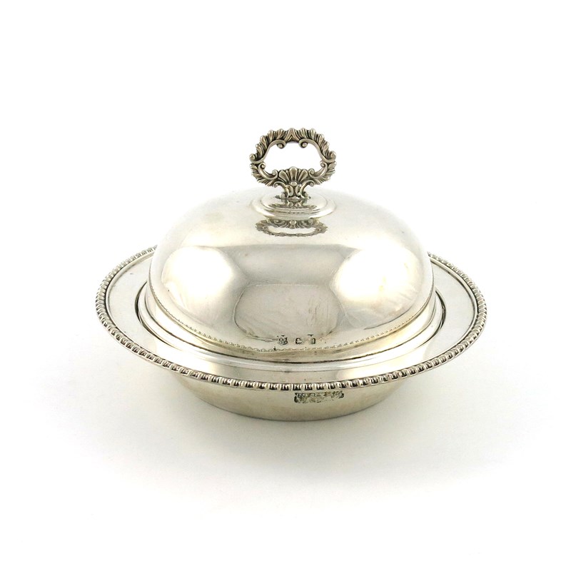 circular form, gadroon border, the domed cover with a gadroon handle, the interior with a liner, diameter 20.5cm, approx. weight 22.8oz.