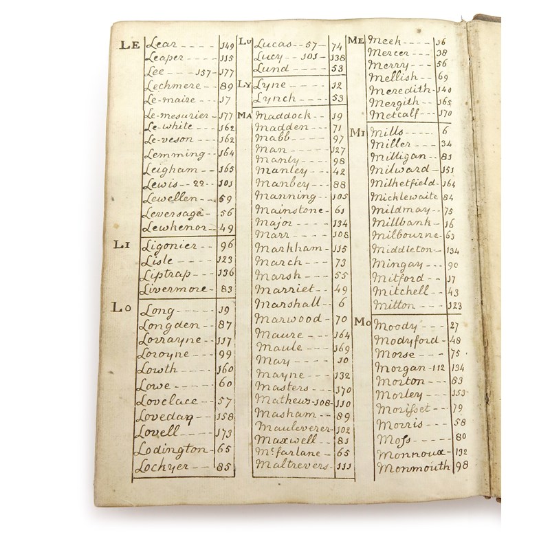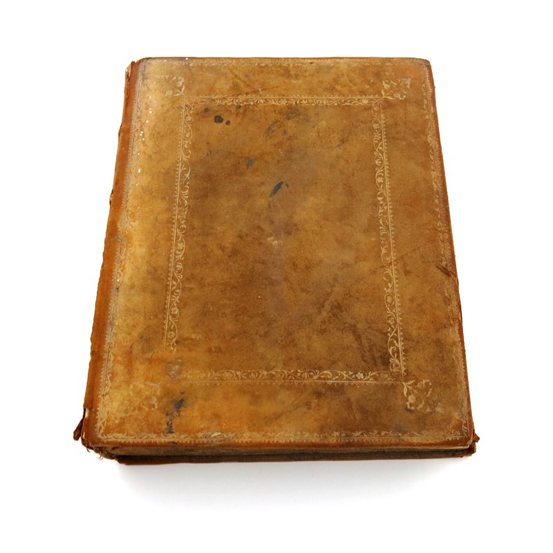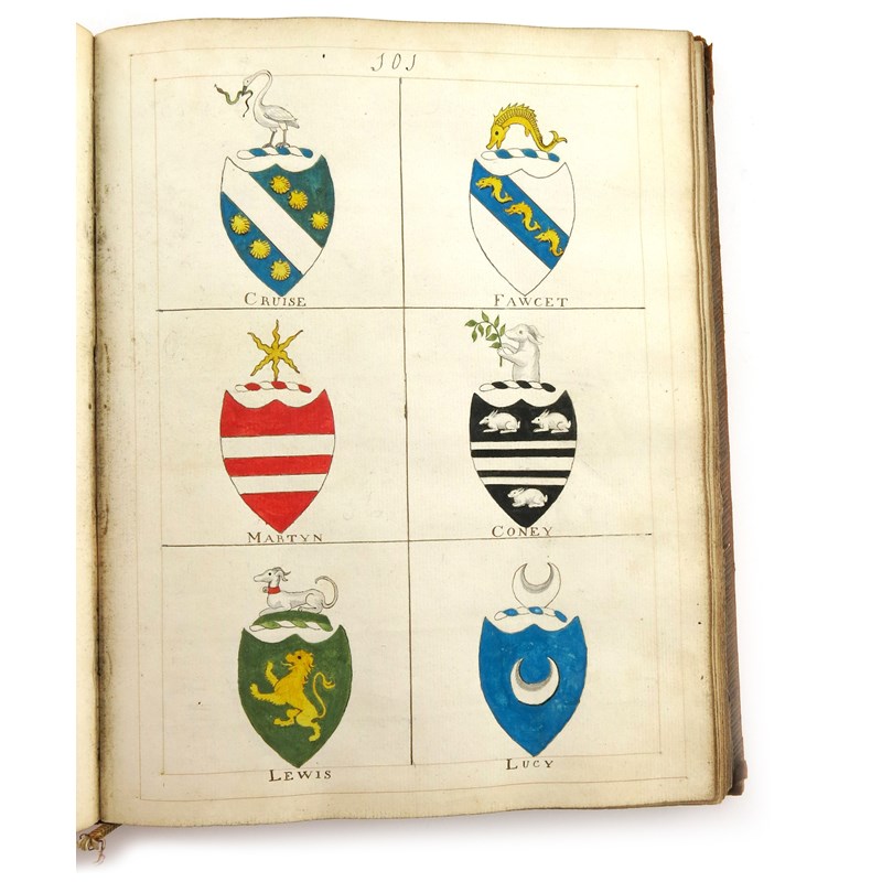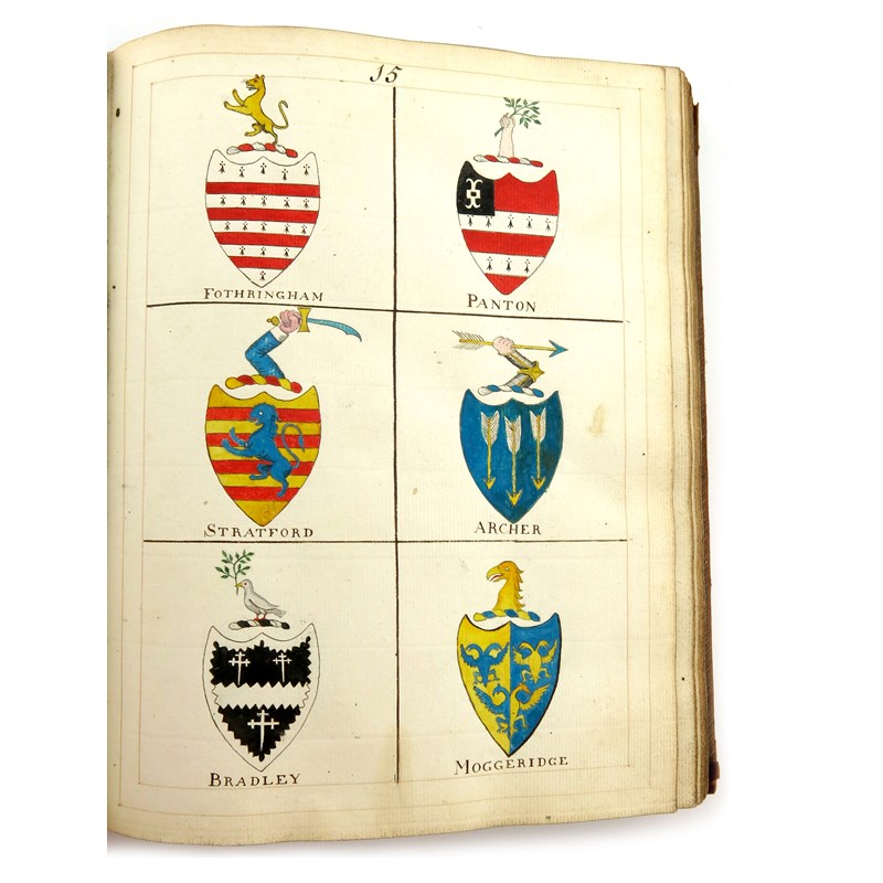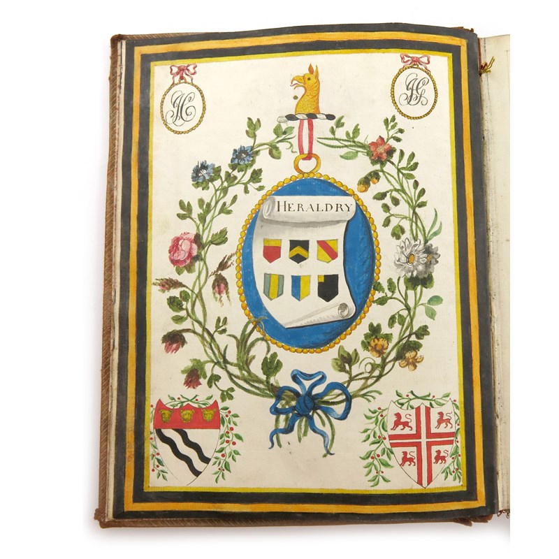 A Heraldry book, signed Joseph Clements and J. Golding 1795, with hand painted crests and armorial shields, with the family names, and with a full index of names in the back, calf-skin covered with tooled decoration, length 26.8cm.