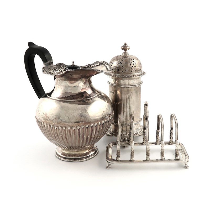 comprising: an Edwardian hot water pot, by The Barnards, London 1903, baluster form, part-fluted decoration, gadroon and shell border, plus a sugar caster of cylindrical form, by The Goldsmiths and Silversmiths Company, London 1915, and a five bar toast rack, London 1914, approx. total weight 32oz. (3)