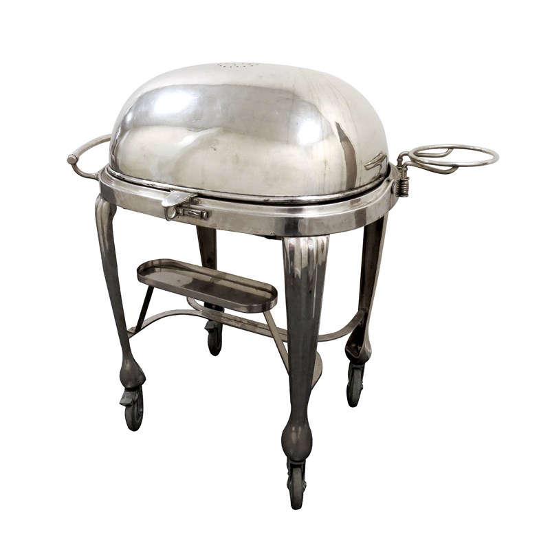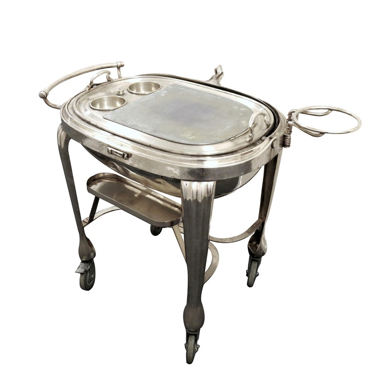 oblong form, revolving hinged cover, with a detachable plate stand, the interior with a hot plate and two circular dishes, lacking burners, on four tapering legs on wheels, height 105cm.