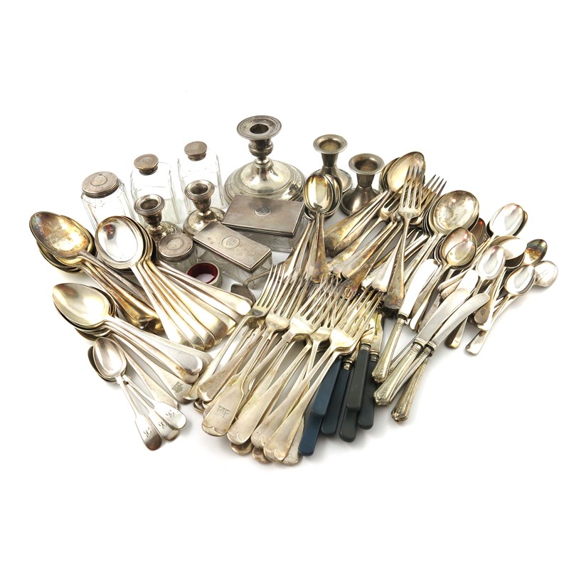 comprising: a pair of dwarf candlesticks, Birmingham 1958, six silver-mounted toilet jars and boxes, plus electroplated items: a pair of dwarf candlesticks, a single candlestick and a quantity of electroplated flatware, approx. weighable 2.5oz. (qty)