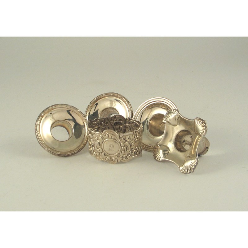 A Victorian decorative napkin ring, 1897, and four candle stick nozzles.