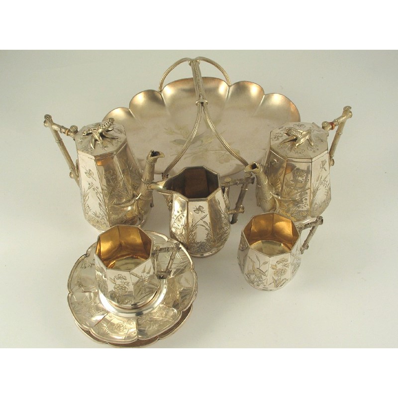 A Victorian plated aesthetic coffee set, comprising coffee pot, hot milk jug, cream jug and two cups and saucers, together with a non-matching plated basket.