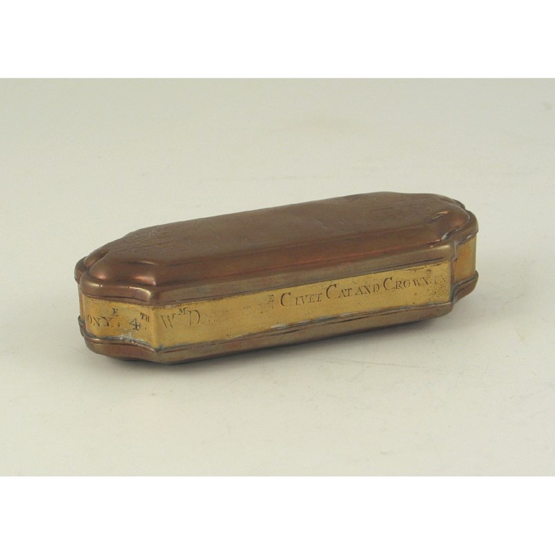 A George II brass and copper tobacco box, with engraving and an interesting inscription around the sides.
