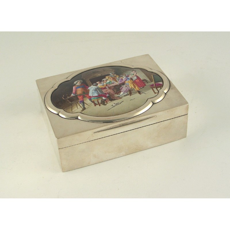 A Victorian cigarette box, the cover inset with a polychrome plaque, by W Wright and F Davies, 1887.