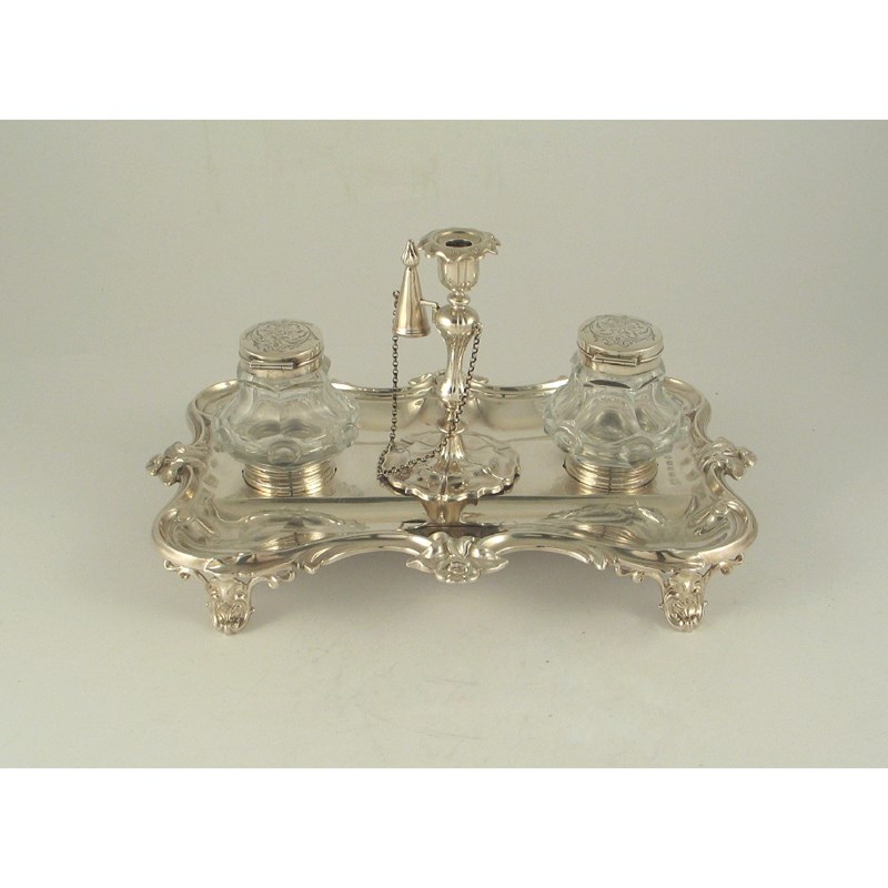 A Victorian inkstand, with central taper stick, by Hawkesworth, Eyre & Co, Sheffield, 1858, with two non-matching later glass ink bottles, 18oz weighable silver.