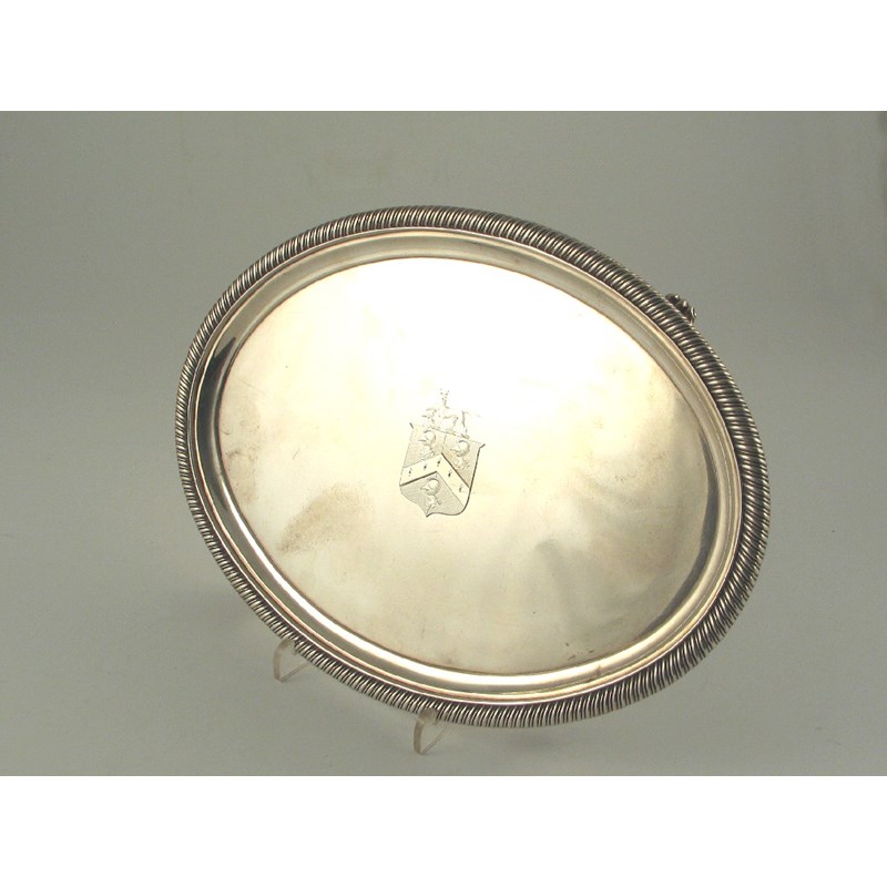 A George III oval salver, with an engraved coat of arms, by Robert Sharp, 1803, 16oz.