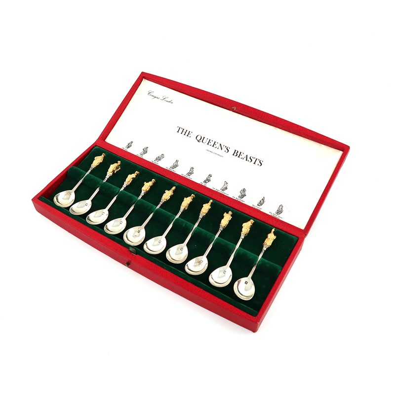 By Richard Comyns, a set of ten modern parcel-gilt silver commemorative Queen's Beast spoons,