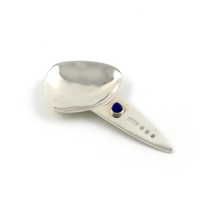 rounded triangular bowl, the tapering handle set with a blue cabochon, length 8.4cm, approx. weight 0.5oz.