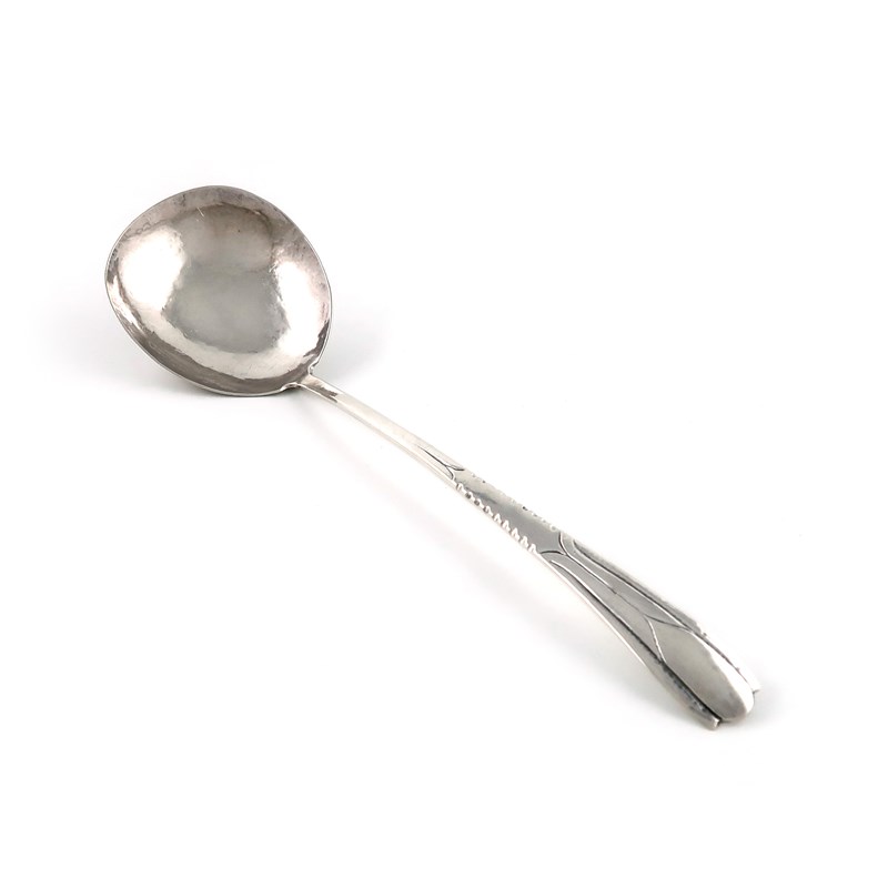 spot-hammered fig-shaped bowl, the tapering handle with notched and stylised decoration, length 27.2cm, approx. weight 3.7oz.