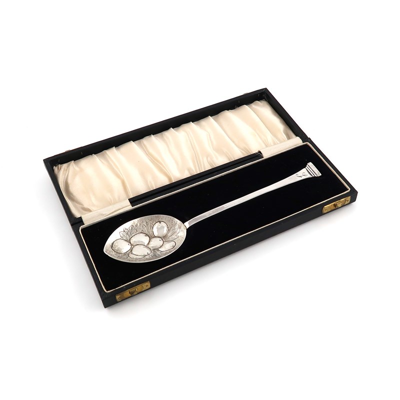 the bowl with embossed decoration, tapering handle with a stylised seal-top finial, initialled, in a fitted case, length 21.2cm, approx. weight 1.8oz.