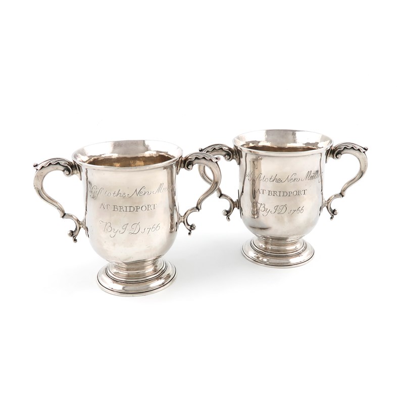 circular form, leaf-capped scroll handles, inscribed 'A Gift to the New Meeting at Bridport by J.D 1766', height 12.3cm, approx. weight 25oz. (2)