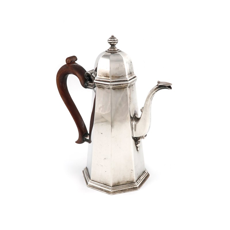in the George I manner, octagonal tapering form, scroll handle, the domed hinged cover with an octagonal knop finial, on an octagonal spread foot, height 25.3cm, approx. weight 27.4oz.