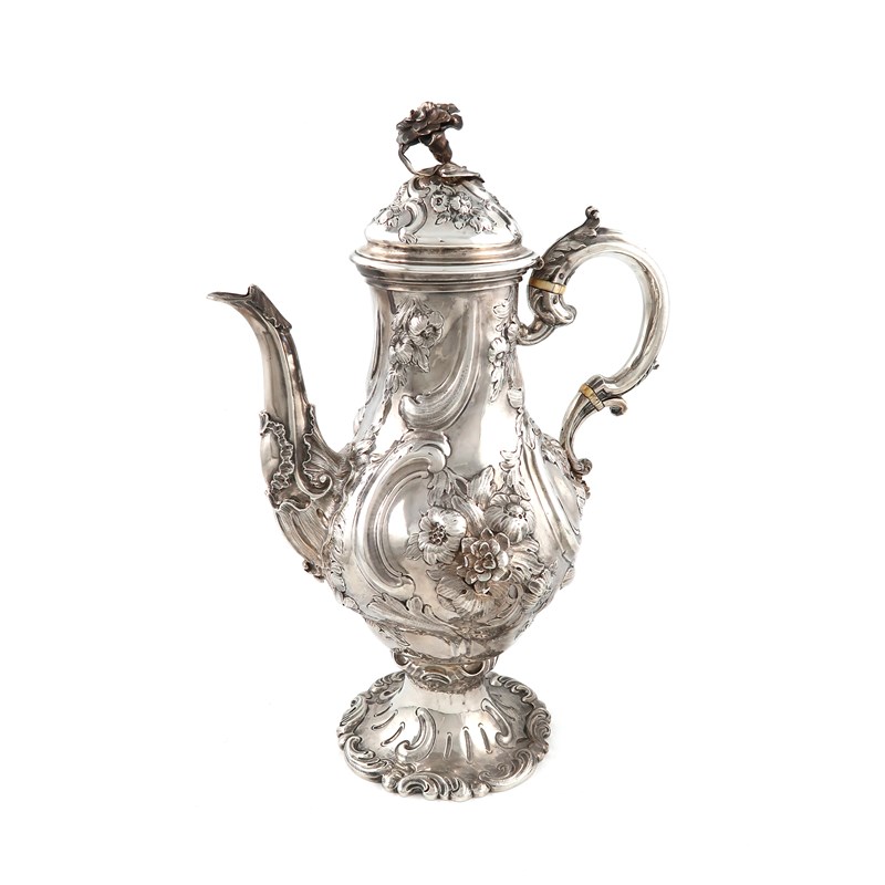 baluster form, embossed and chased with foliate scrolls and garlands of flowers, engraved with a coronet, leaf-capped scroll handle with ivory insulators, the hinged cover with a finial modelled as a flower, on a raised circular foot with a foliate scroll border, height 32.8cm, approx. weight 33.2oz.