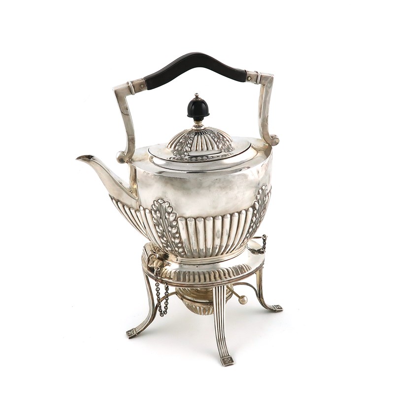 oval form, part-fluted and acanthus leaf decoration, on an oval stand on four fluted legs, lift out part-fluted burner, height 31cm, approx. weight 35oz.