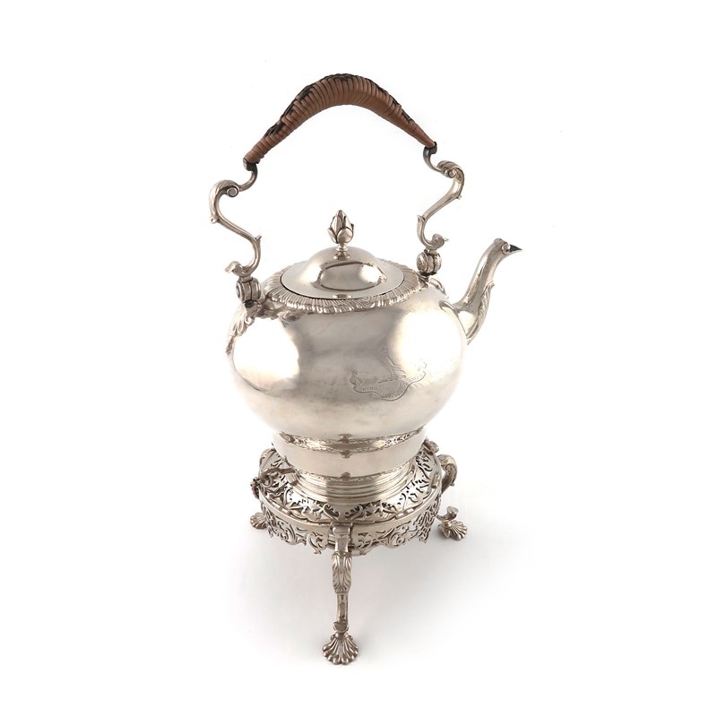 baluster form, wicker-bound swing-handle, gadroon border, leaf capped spout, hinged wicker-bound handle, the stand of pierced circular form, on three scroll legs on pad feet, with a burner, height 38cm, approx. weight 60oz. (2)
