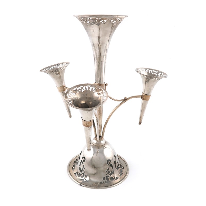 central tapering pierced vase, with three scroll arms each supporting a pierced vase, on a raised pierced circular foot, some pitch to underside of base, height 30.4cm.