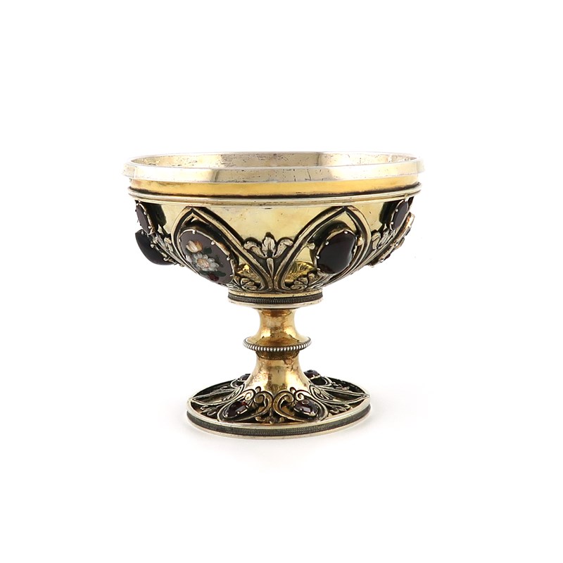 circular form, in the Beckford manner, applied with red cabochons and oval glass cameos of flowers, on a raised circular foot, diameter 9.8cm, height 8.7cm, approx. weight 7.4oz.