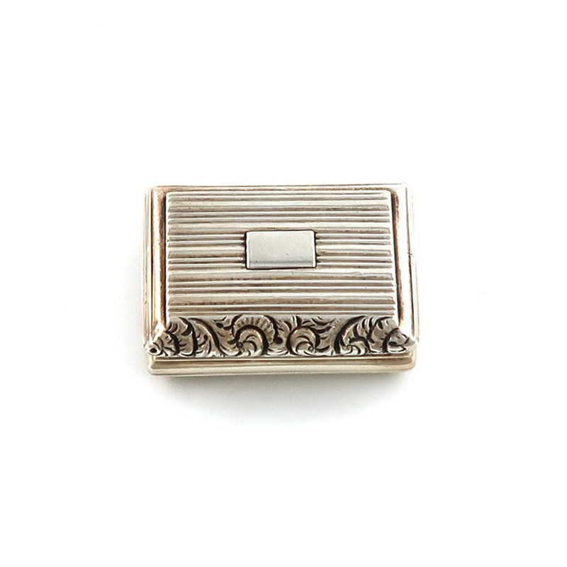 rectangular form, reeded decoration, the hinged cover with a foliate scroll thumbpiece and a vacant cartouche, gilt interior, hinged pierced foliate grille, length 3.5cm, approx. weight 0.7oz.