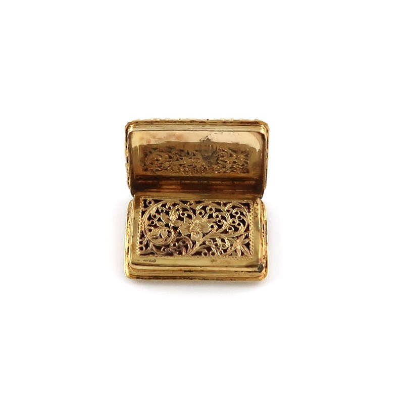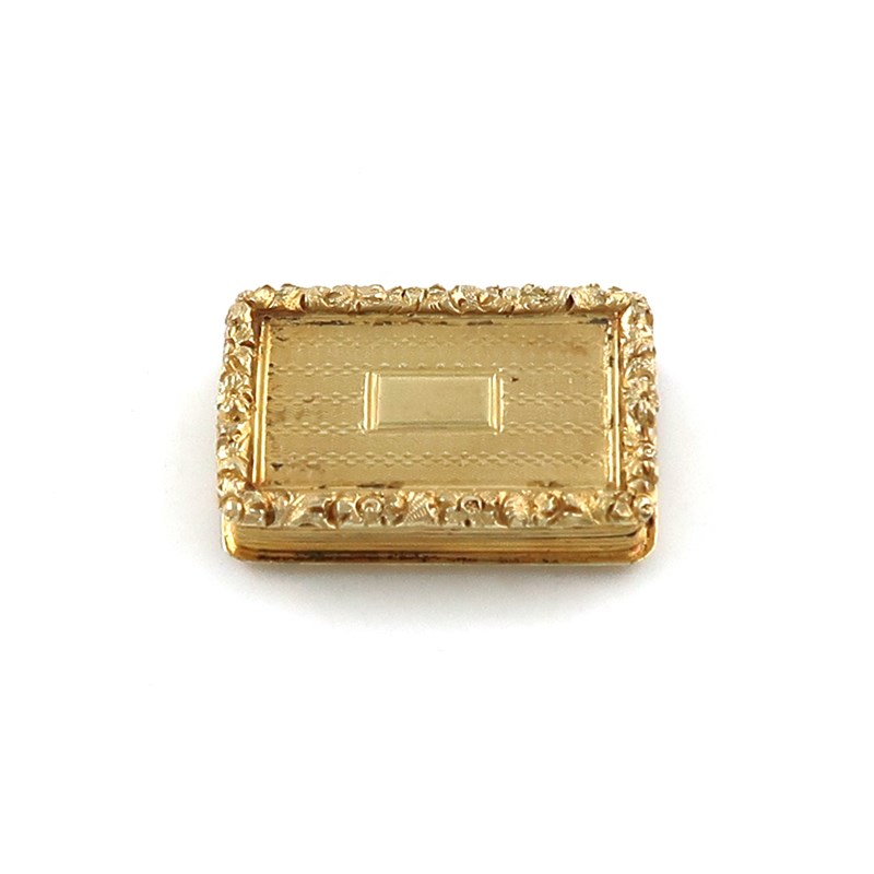 rectangular form, engine-turned decoration, chased foliate scroll border, the hinged cover with a vacant cartouche, gilt interior, hinged pierced foliate grille, length 3.7cm, approx. weight 0.5oz.
