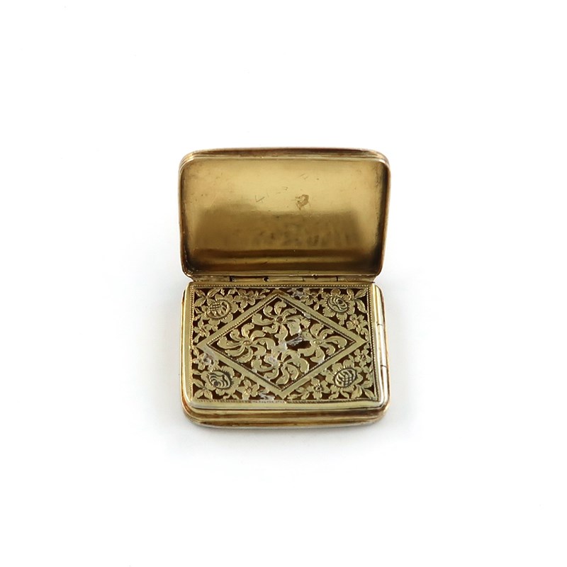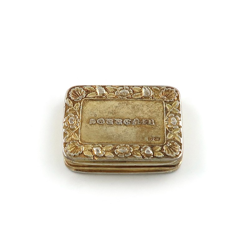 rectangular form, reeded sides, the hinged cover with a foliate shell border around the inscription 'SOUVENIR', the base with chased shell and scroll decoration, gilt interior, hinged pierced foliate grille, length 4cm, approx. weight 0.8oz.