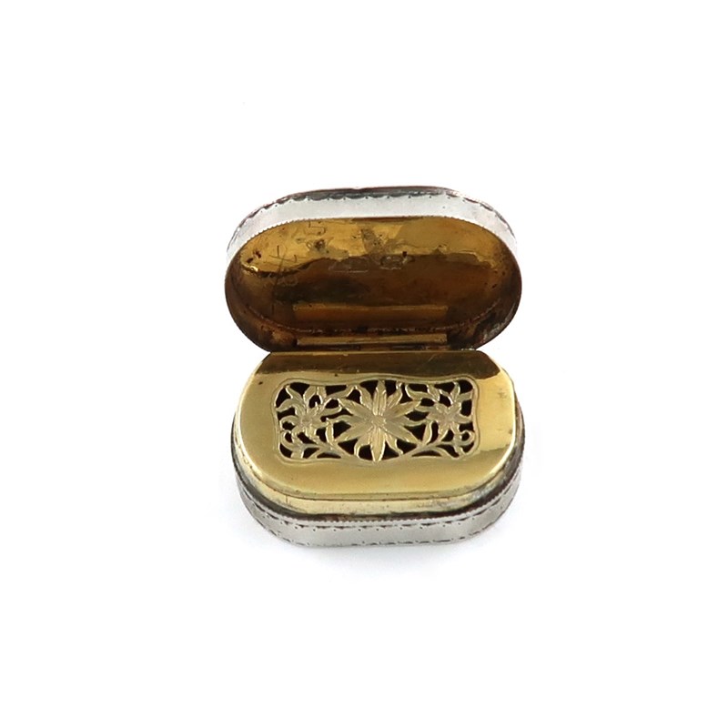 oval form, bright-cut decoration with a dove to the cover and musical instruments to the base, gilt interior, hinged pierced foliate grille, length 3.3cm, approx. weight 0.5oz.