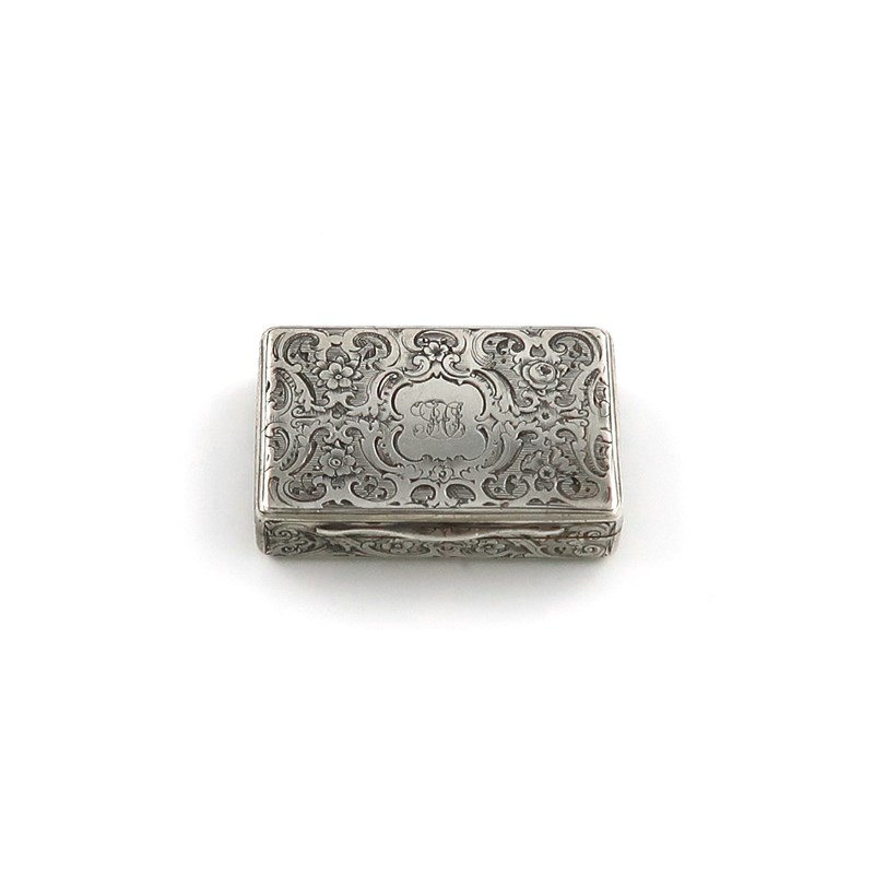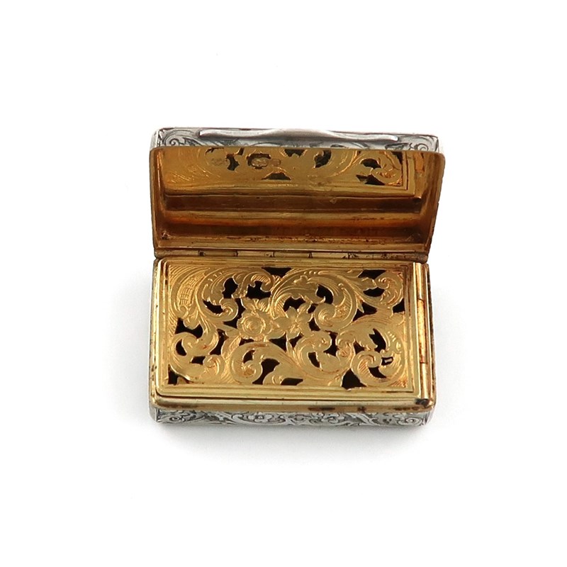 rectangular form, foliate scroll decoration, the hinged cover with an initialled cartouche, the base with a folly in a landscape, gilt interior, hinged pierced foliate grille, length 4cm, approx. weight 1oz.