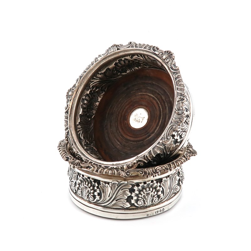 circular form, chased foliate shell decoration, gadroon and foliate shell borders, turned wooden bases with central crested silver buttons, diameter 16cm. (2)