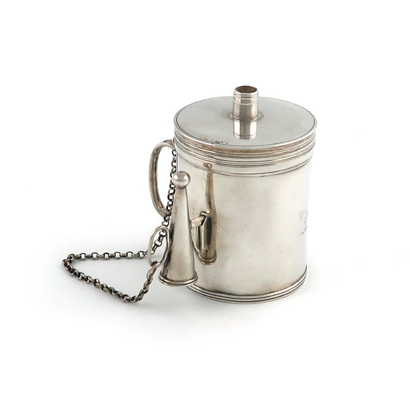 cylindrical form, reeded borders, ring handle, pull-off cover, conical snuffer affixed with a chain, diameter 5.2cm, approx. weight 3.4oz.