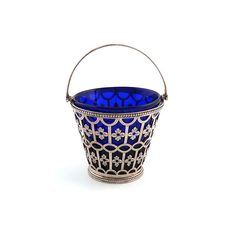 tapering circular form, pieced and engraved foliate decoration, reeded swing-handle, beaded borders, with a blue glass liner, height (handle up) 11.3cm, approx. weight 2.9oz.