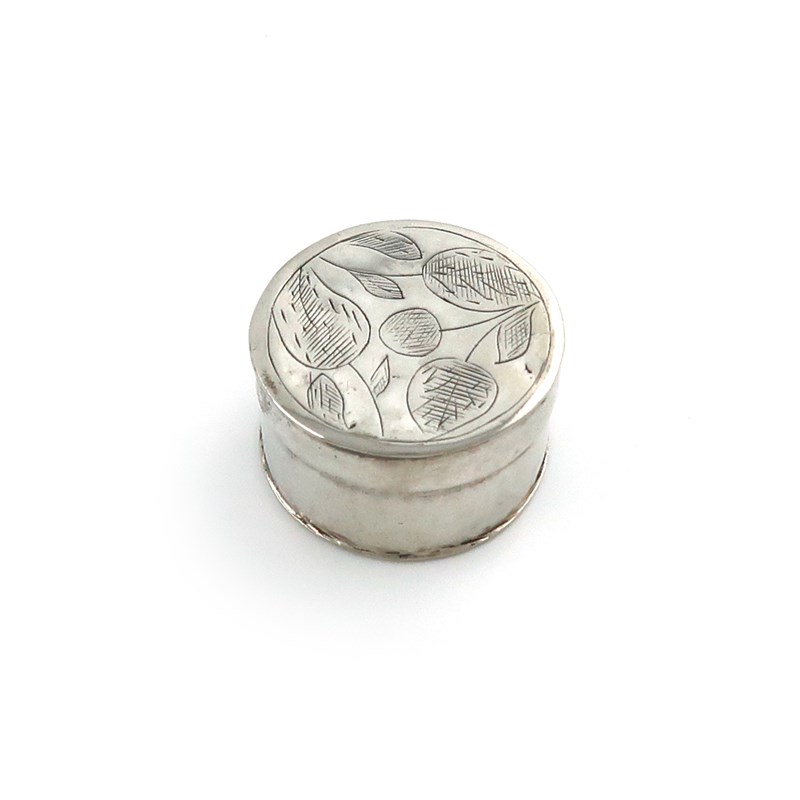 circular form, the pull-off cover with foliate decoration, the base with scratch initials 'E.C', diameter 3.2cm, approx. weight 0.5oz.