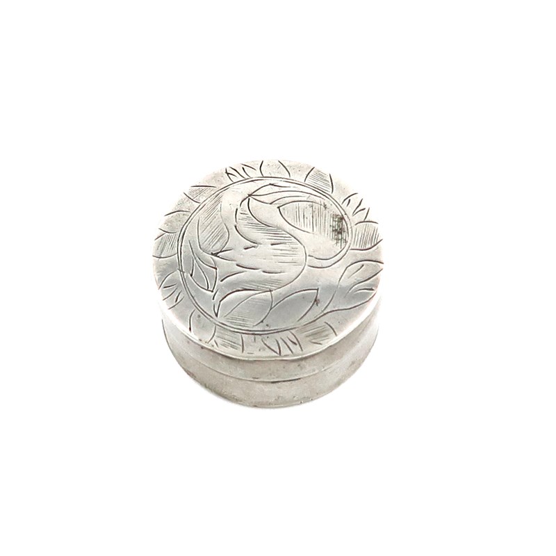 circular form, the pull-off cover engraved with a flower, the base with scratch initials 'W*C' over '1675', diameter 3.2cm, approx. weight 0.4oz.