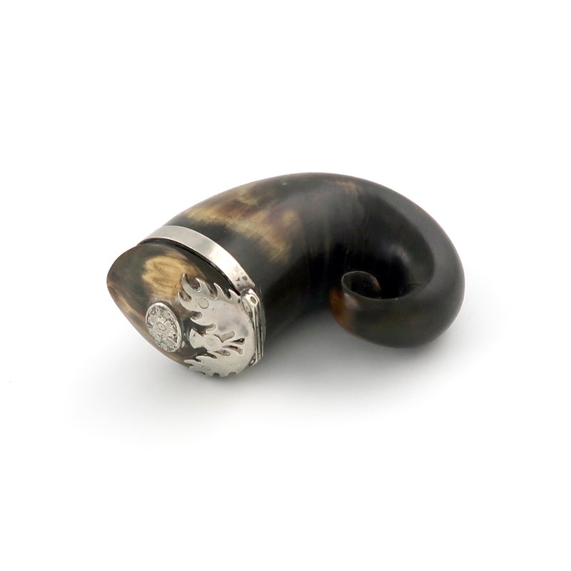conventional form, the hinged cover set with a thistle and an oval cartouche with bright-cut floral decoration, length 7.4cm.
