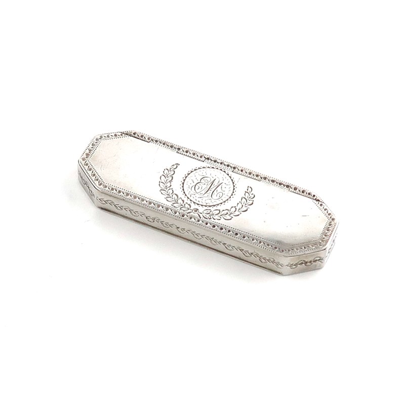 rectangular form, bright-cut decoration, the cover with initials, length 9cm, approx. weight 1.6oz.