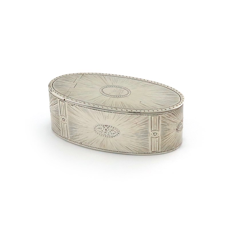 oval form, bright-cut and sunray decoration, the flush-hinged cover with a crested cartouche, gilt interior, the underside of the cover with an initialled shield, length 8.5cm, approx. weight 2.6oz.