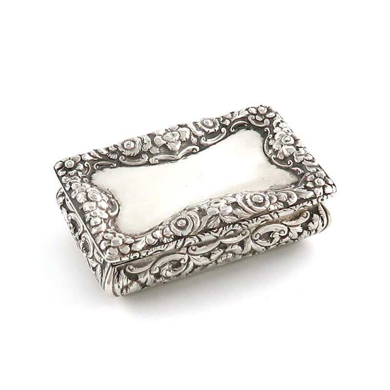 cushioned rectangular form, chased floral scroll borders, engine-turned decoration to the sides and base, gilt interior, length 6.8cm, approx. weight 2.6oz.