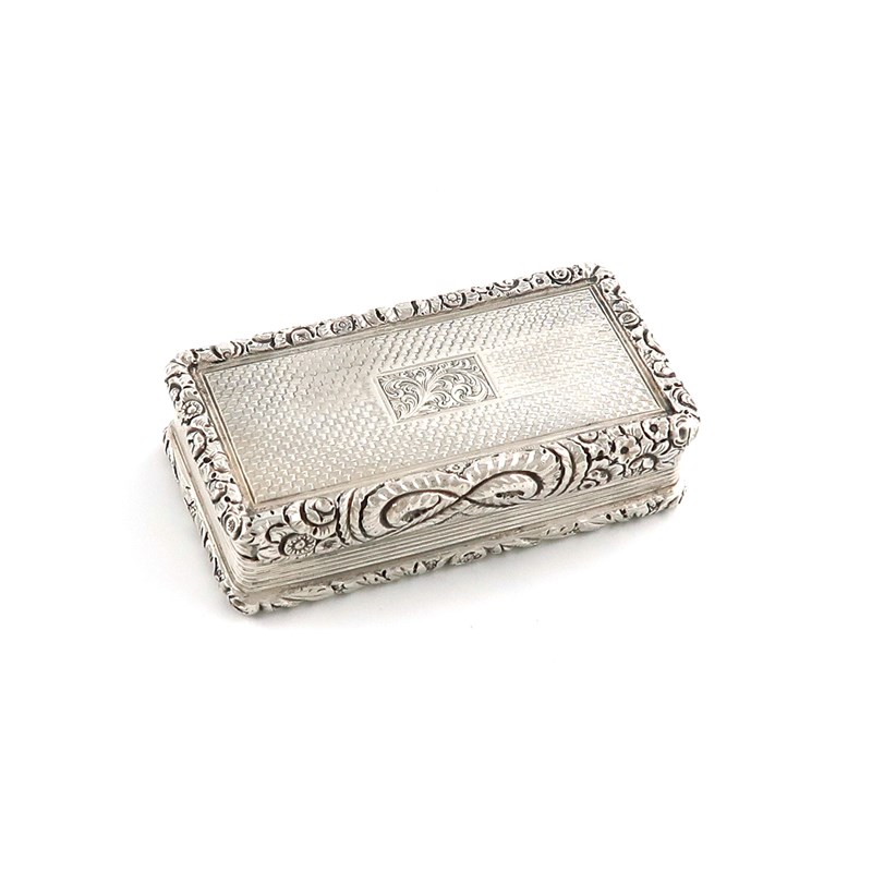 rectangular form, reeded decoration to the sides, floral scroll borders, engine-turned decoration to base and the hinged cover, gilt interior, length 7.6cm, approx. weight 3.4oz.