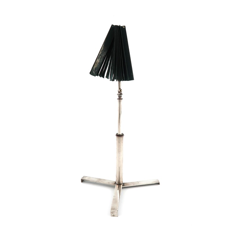 cylindrical form, concertina green silk shade (a/f), on three folding supports, length closed 13.4cm.
